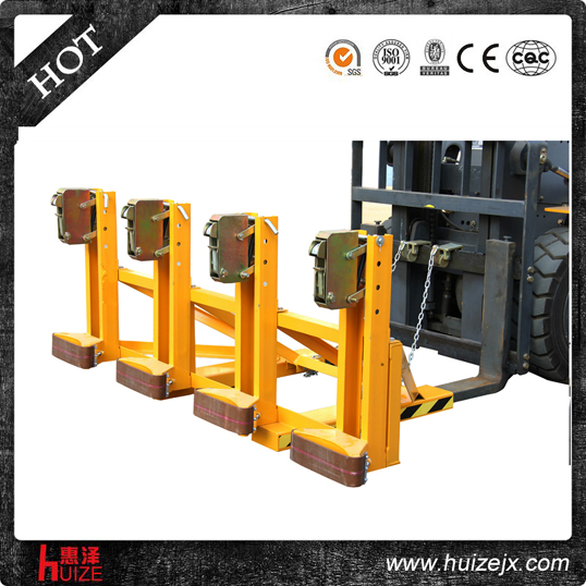 重型四油桶夾單鷹嘴DG2000A純機械機構設計可與叉車方便地配合,僅依靠叉車的動作,不需要其它的動力,可自動一次搬運4個鋼制油桶, 配置可拆換式柔性耐磨保護墊,有效保護油桶并緩沖叉車行駛過程中的震動, 能在集裝箱等這樣狹小的環(huán)境內(nèi)裝卸桶裝物質(zhì),可極大地提高空間利用率, 與貨叉連接配有自鎖裝置確保油桶夾在坡度上和顛簸路面使用時不會滑落.